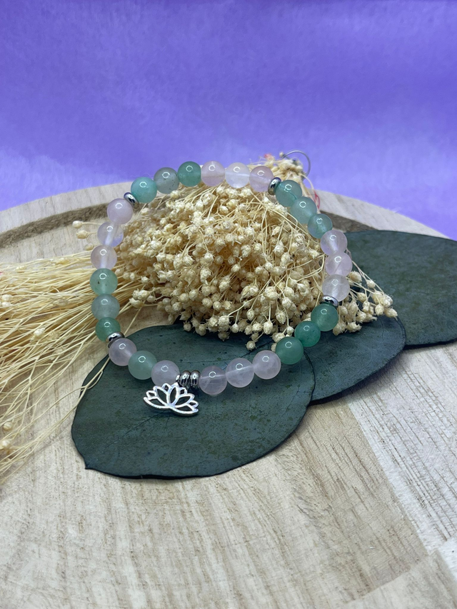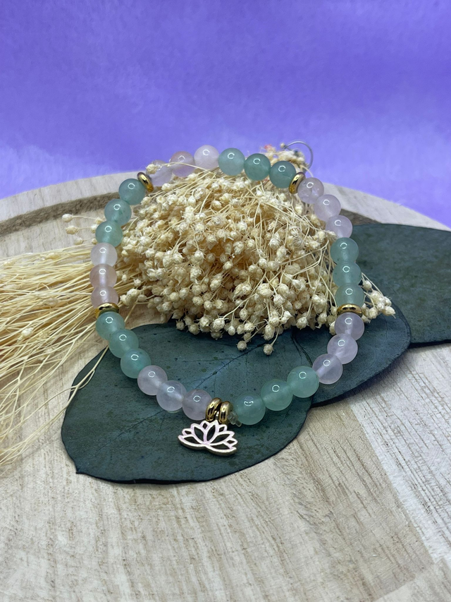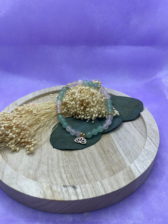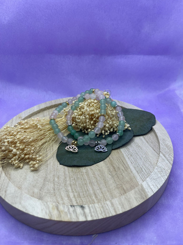 Le quartz rose accompagne la douceur et l’apaisement, tandis que l’aventurine verte soutient l’harmonie et la sérénité intérieure.