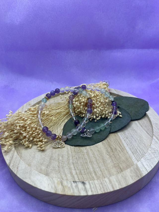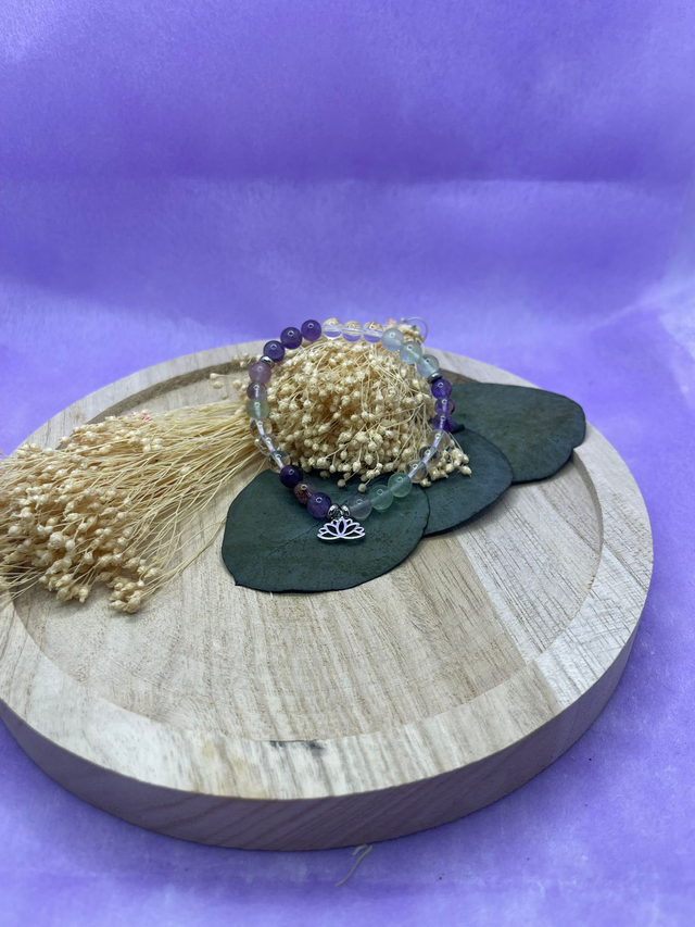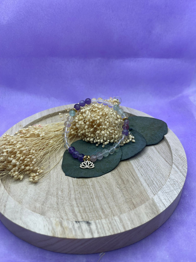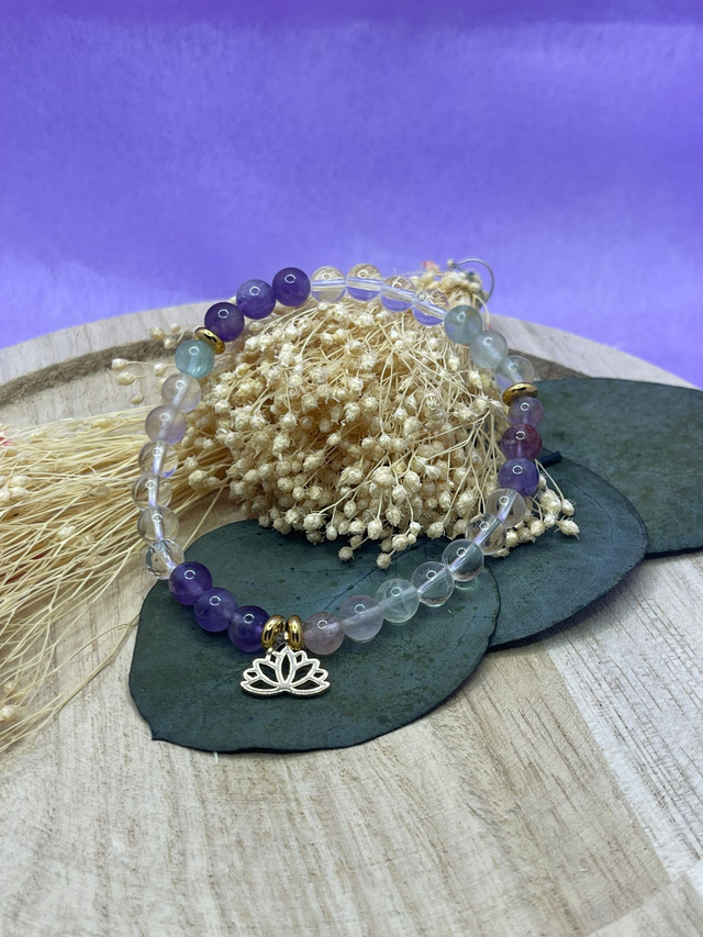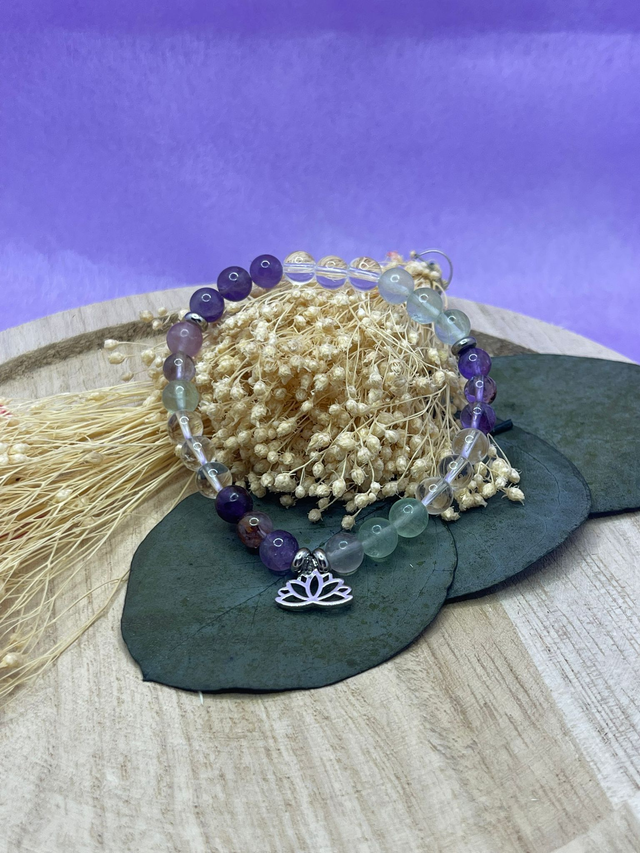 Bracelet énergétique en pierres naturelles composé de cristal de roche, fluorite et améthyste.