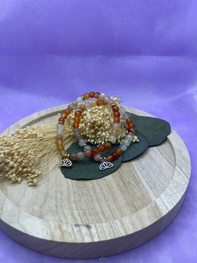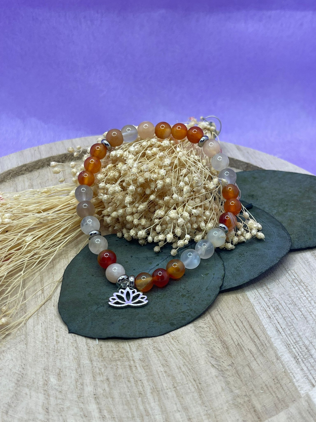 La cornaline soutient l’élan, la dynamique et l’énergie de vie, tandis que la pierre de lune accompagne la douceur émotionnelle et l’intuition.
