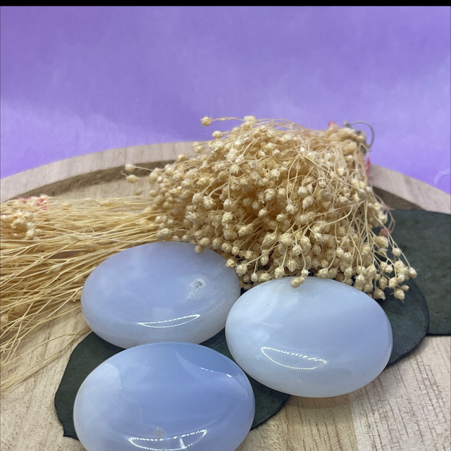 Pierre plate Calcédoine bleue — Sérénité · Bienveillance · Amabilité